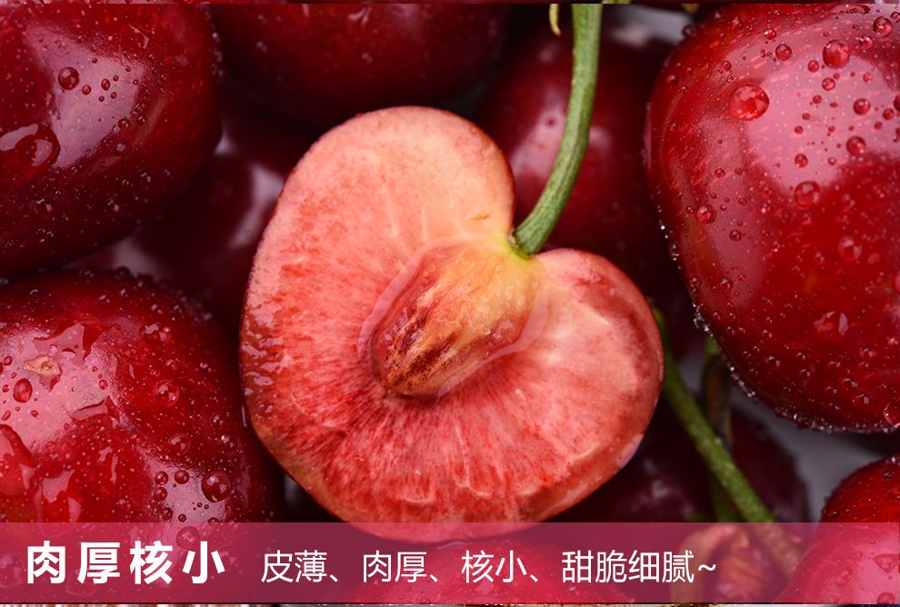 美早樱桃 果实大而厚,核小,肉质嫩而多汁,口感极甜。